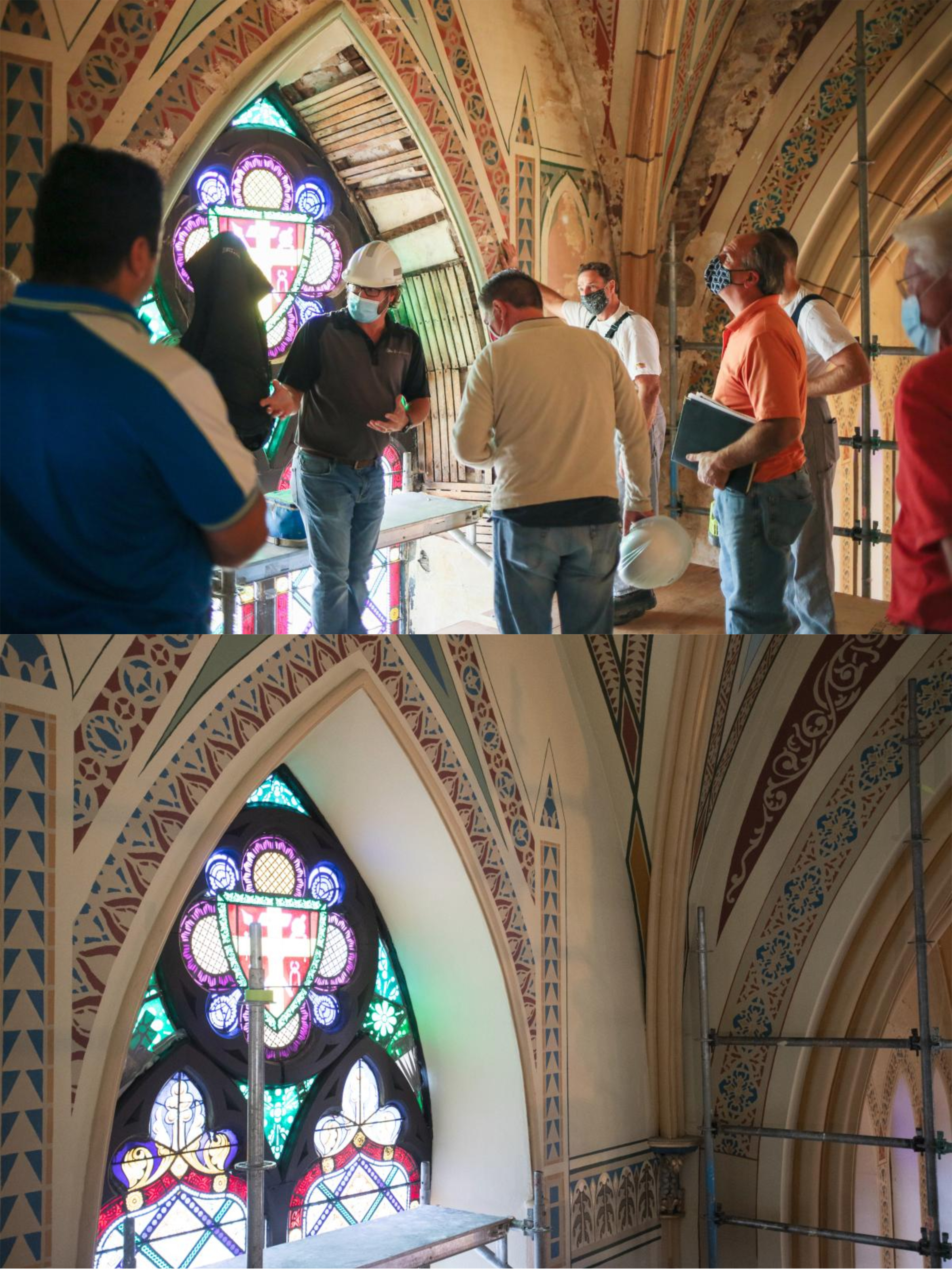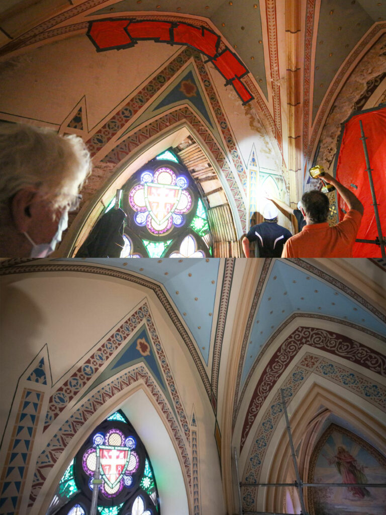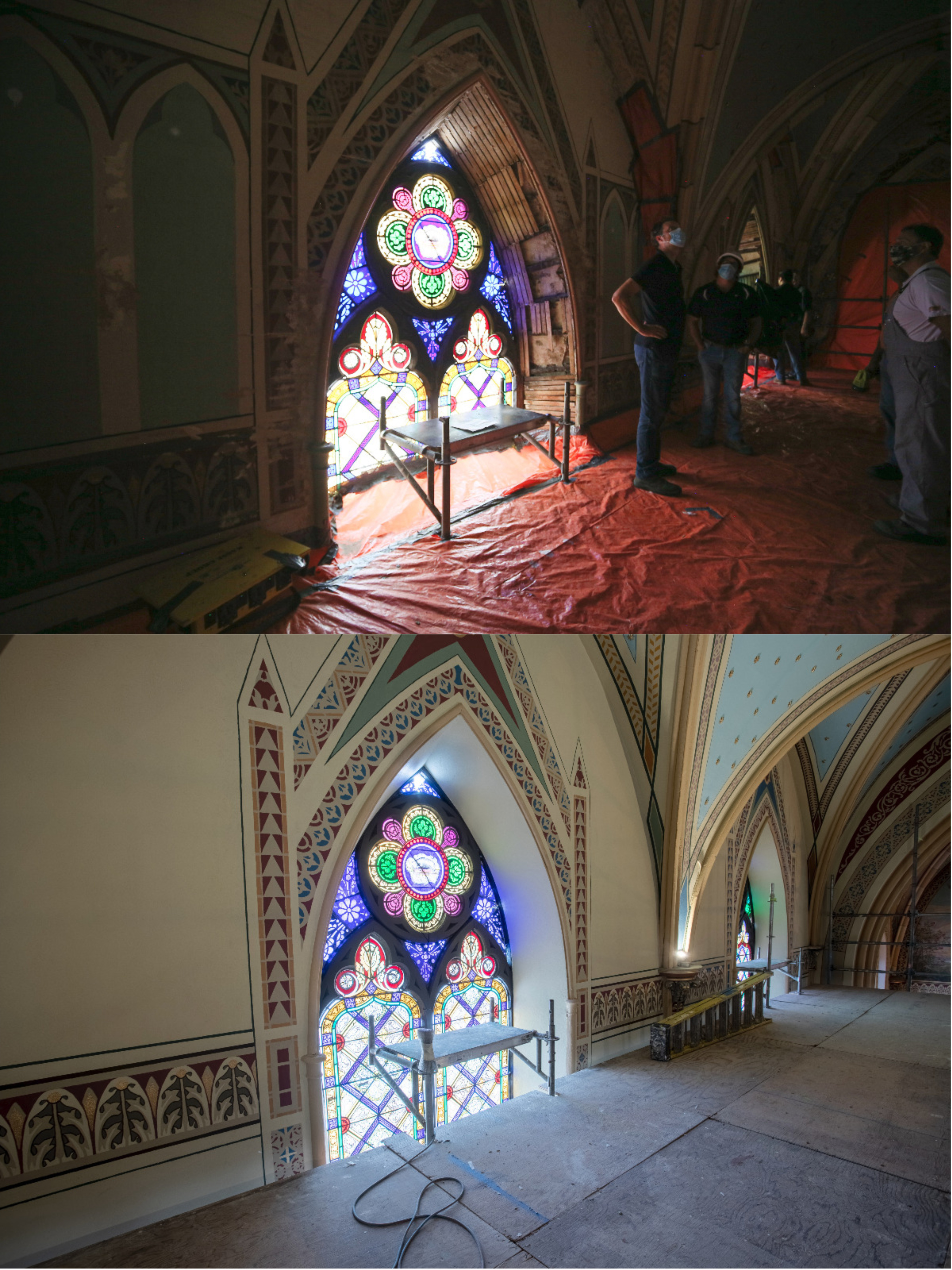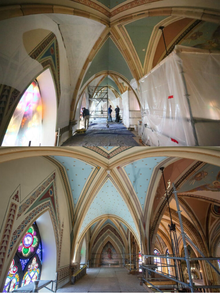 Restoration work is wrapping up on the first three bays of the East wall at Assumption Church.