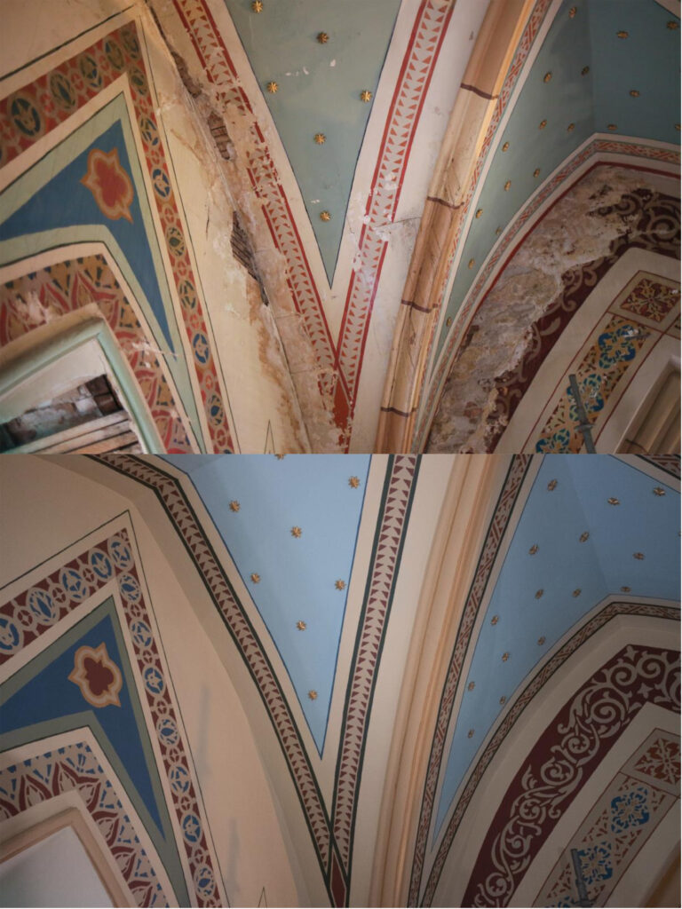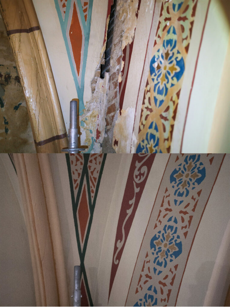 Painters have repainted every inch of the ceiling and walls by hand.