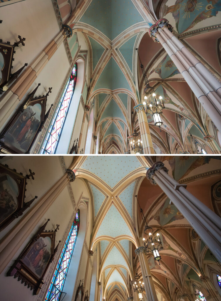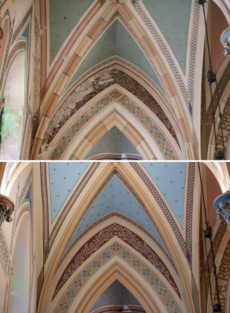 Restoration work is finished on the the East wall at Assumption Church. Here are photos of the before and after showing the area now that the scaffolding has come down.
