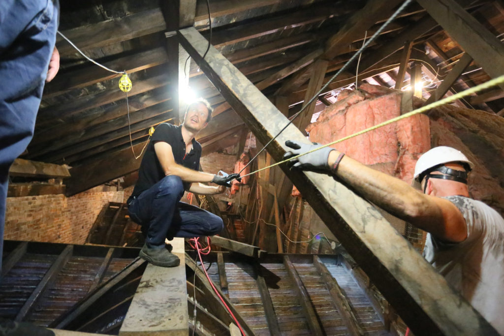 Eric Stewart (centre) explains the process of consolidating the plaster. This photo is located in the attic above the left (east) aisle of the church in an area that suffered the worst plaster damage from water leaks over the years.