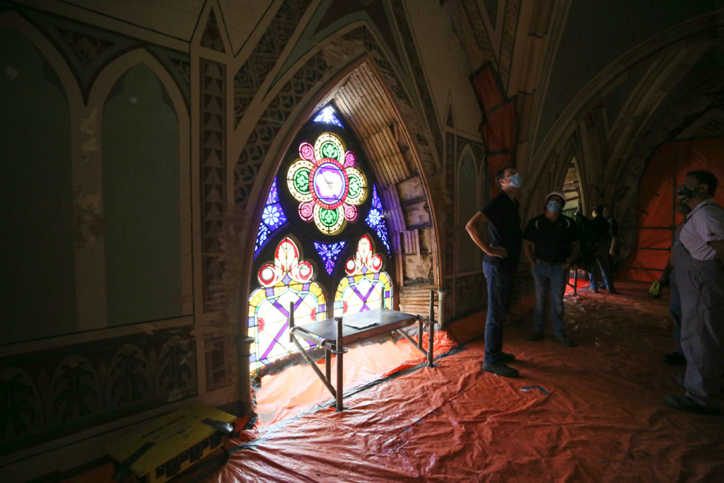 A look at one of the church’s stained glass windows where areas of plaster that suffered water damage has been removed.