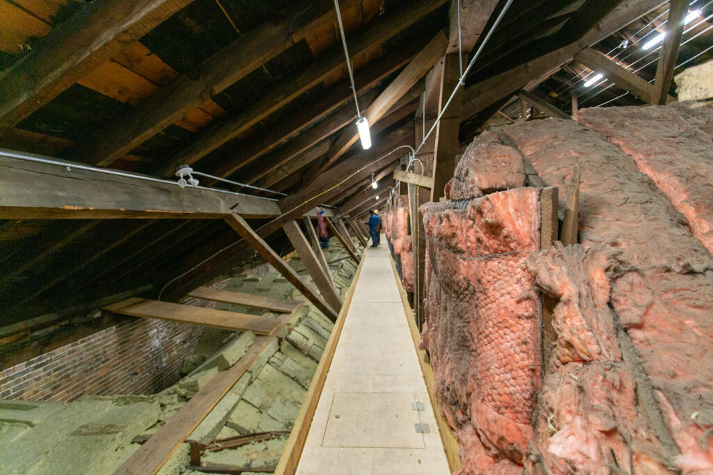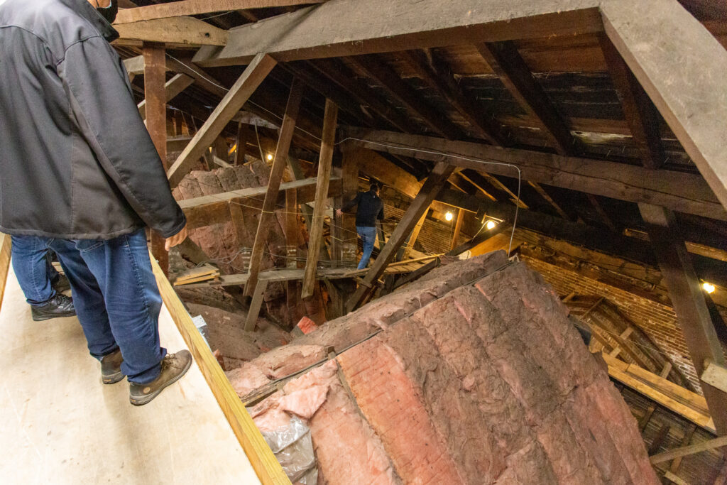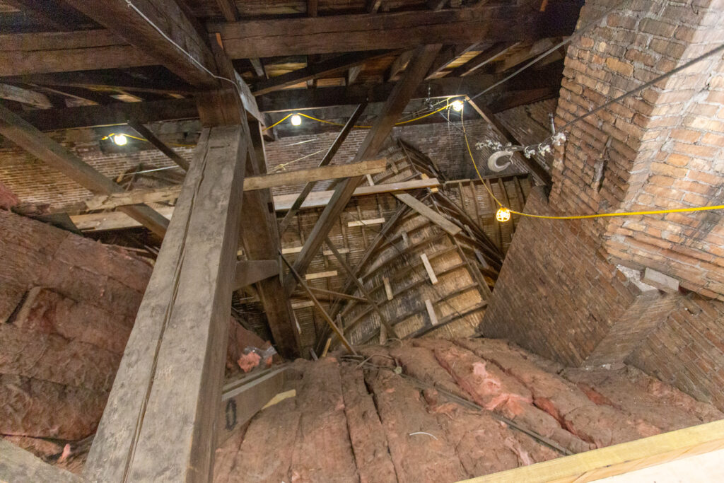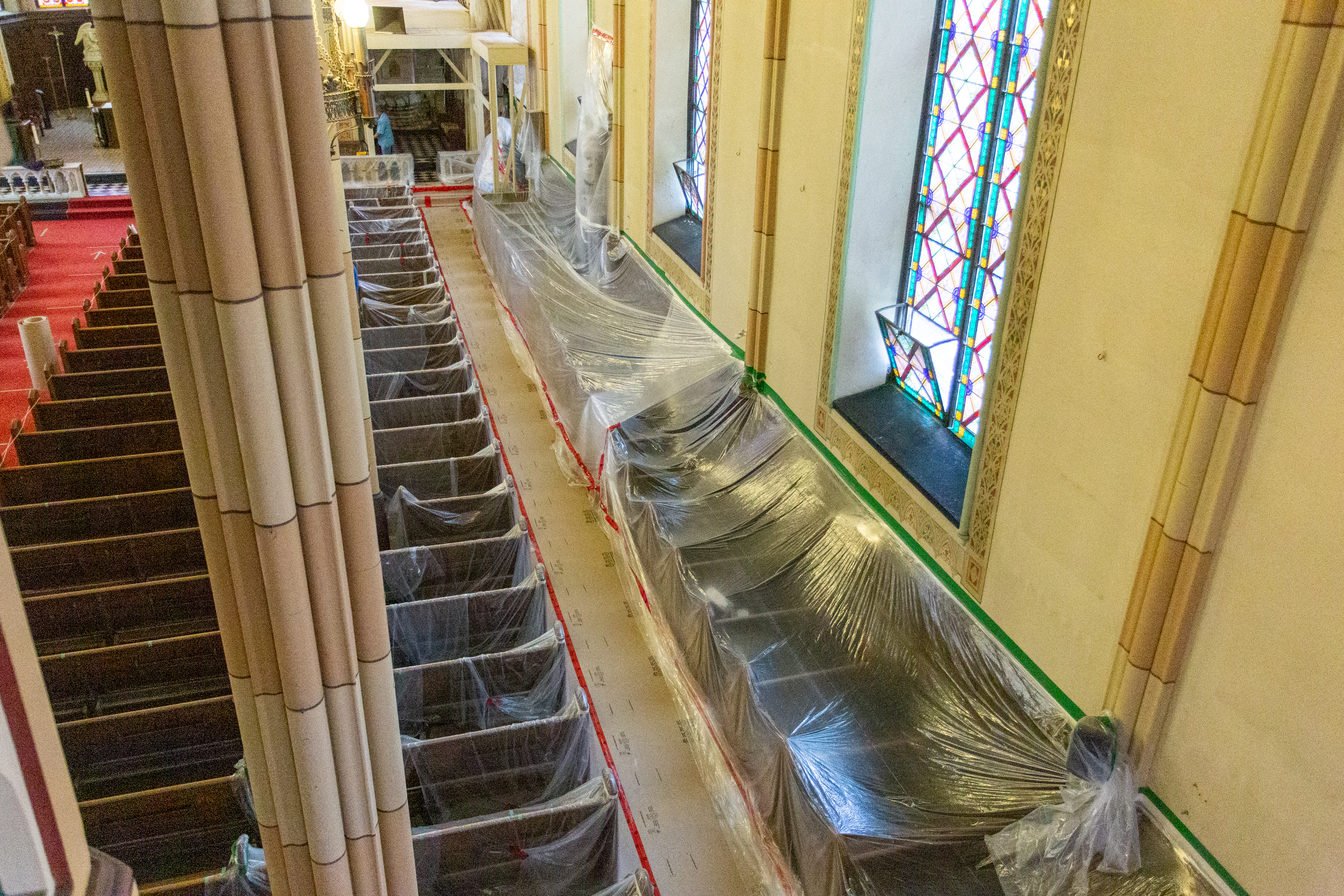 Consolidation of the ceiling plaster on the west side of Assumption Church has begun.