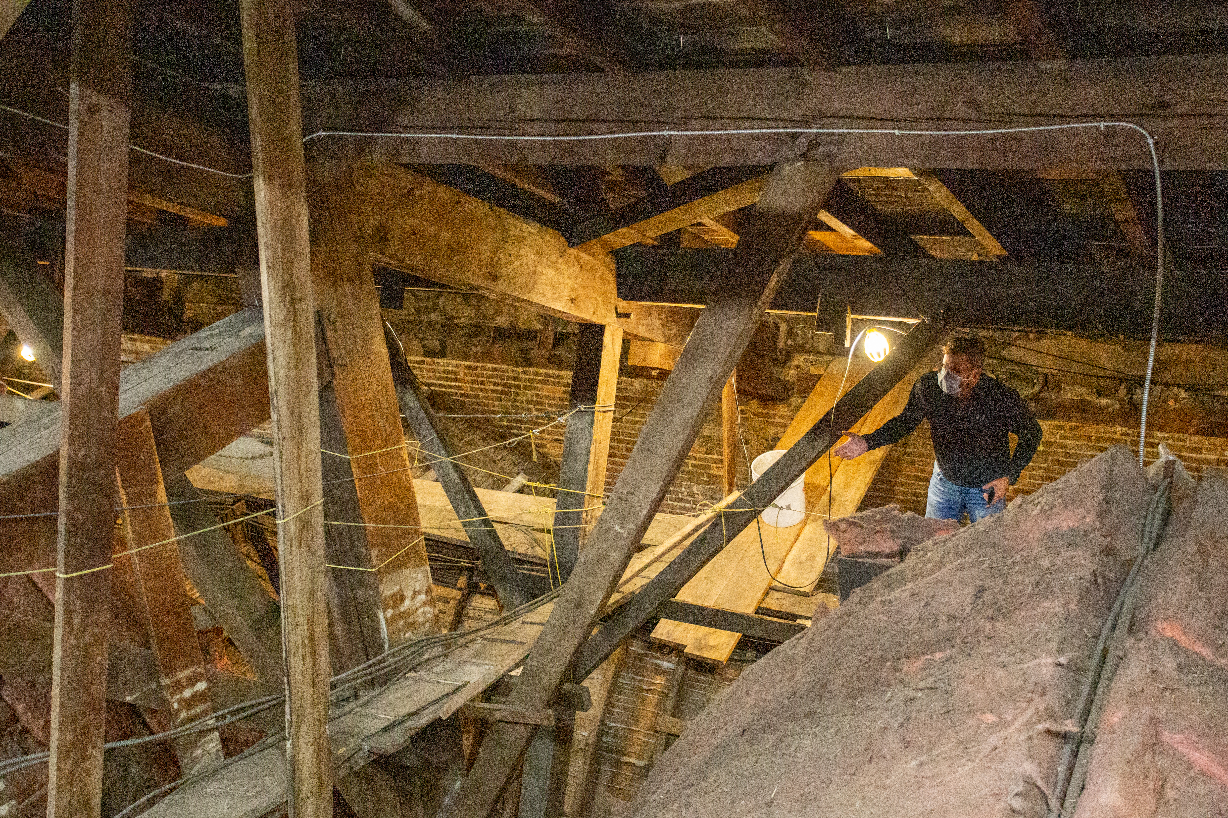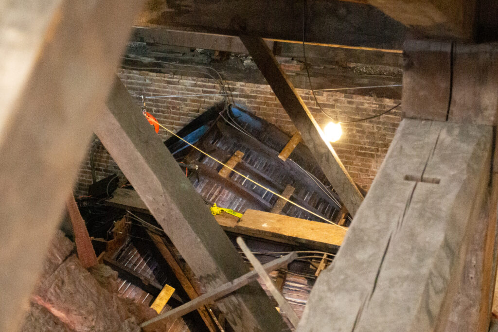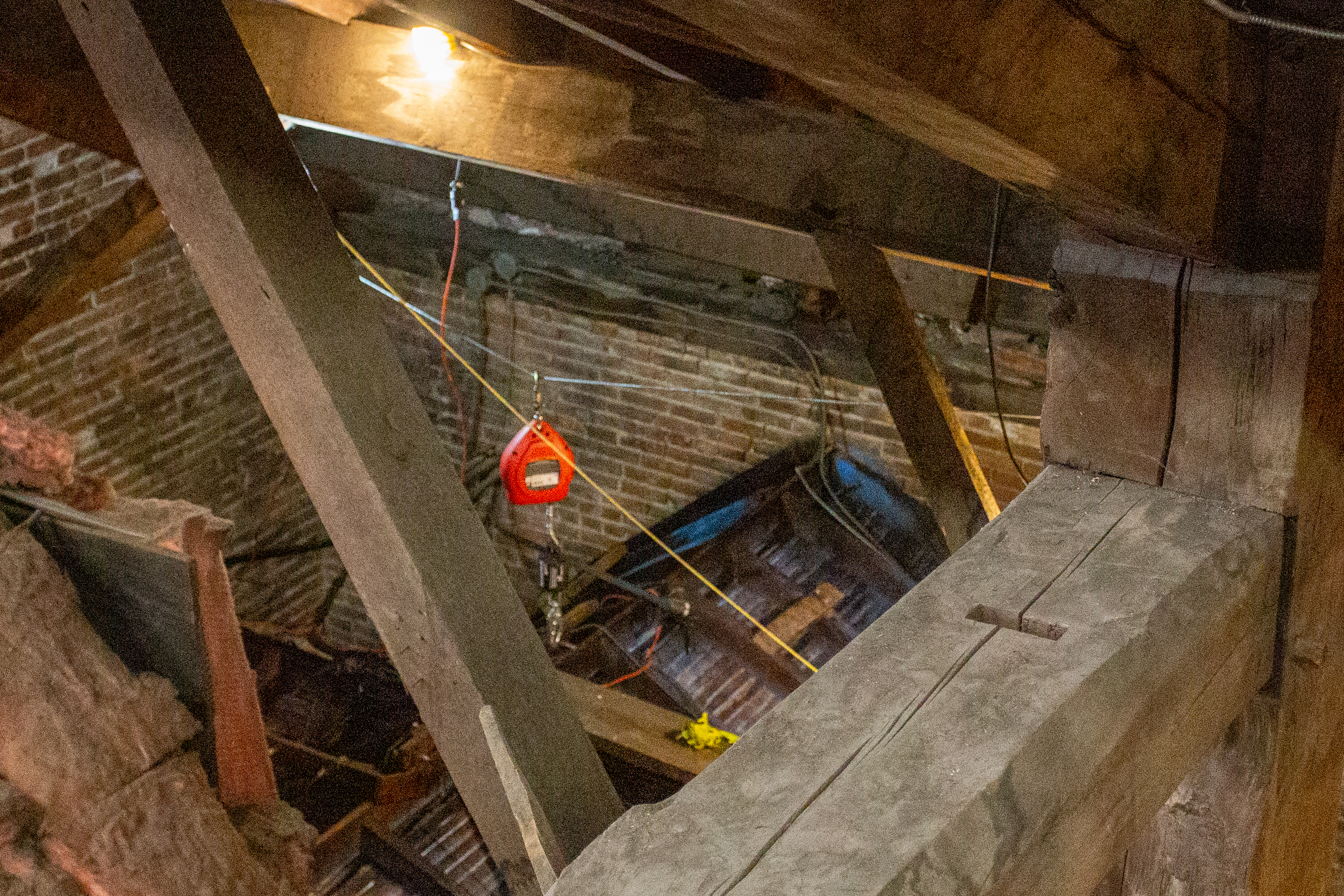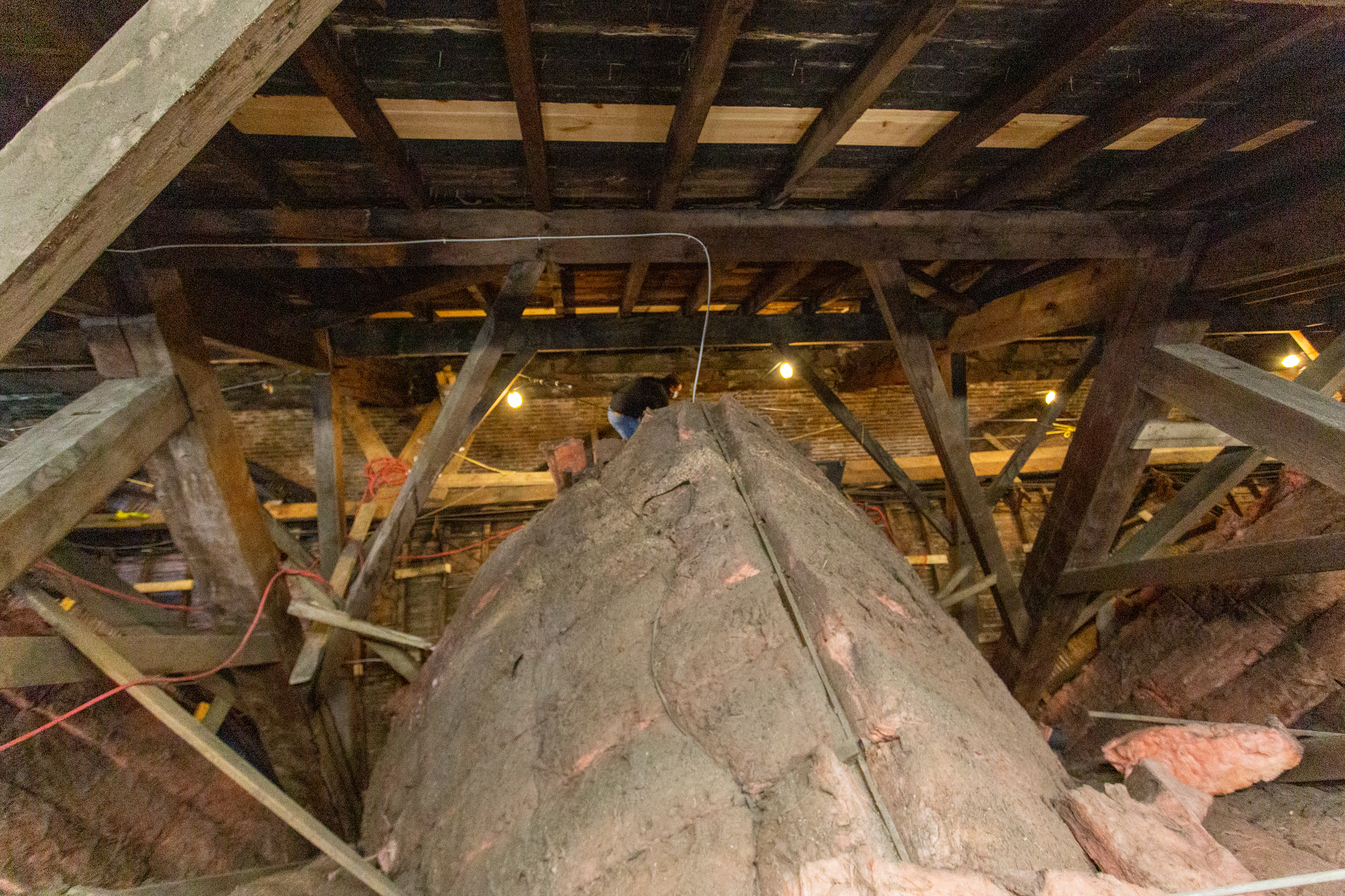 Consolidation of the ceiling plaster on the west side of Assumption Church has begun.