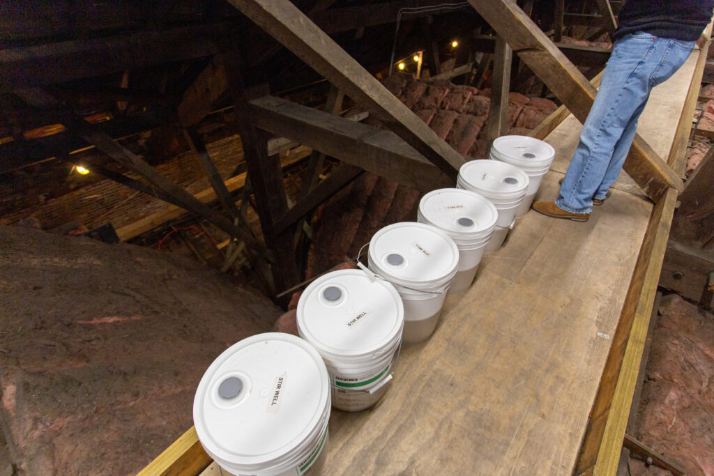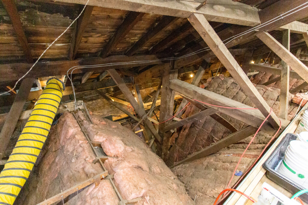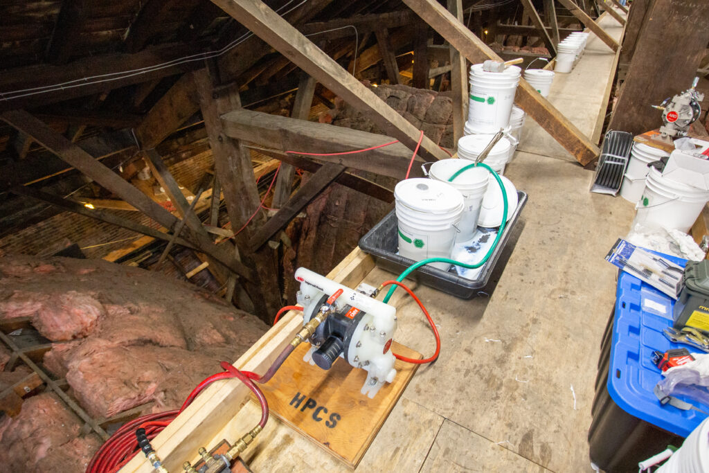 Consolidate is applied to the back of the laths (wood strips between the ceiling’s framing). The acrylic-based solution will act as a glue that will hold the plaster keys (between the cracks of the laths) to the laths themselves. The process is applied three times using solutions of 20%, 50% and 100%.