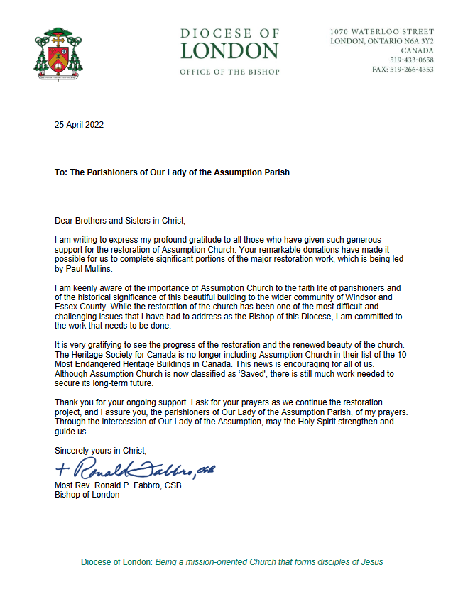 Categories: Restoration News Bishop Fabbro has written the attached letter to Parishioners of Assumption Parish.