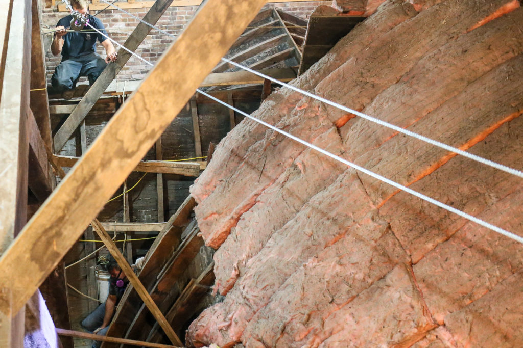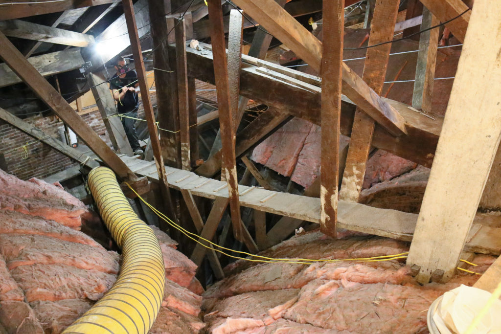 Workers use a pulley system to transfer tools between different areas of the attic.