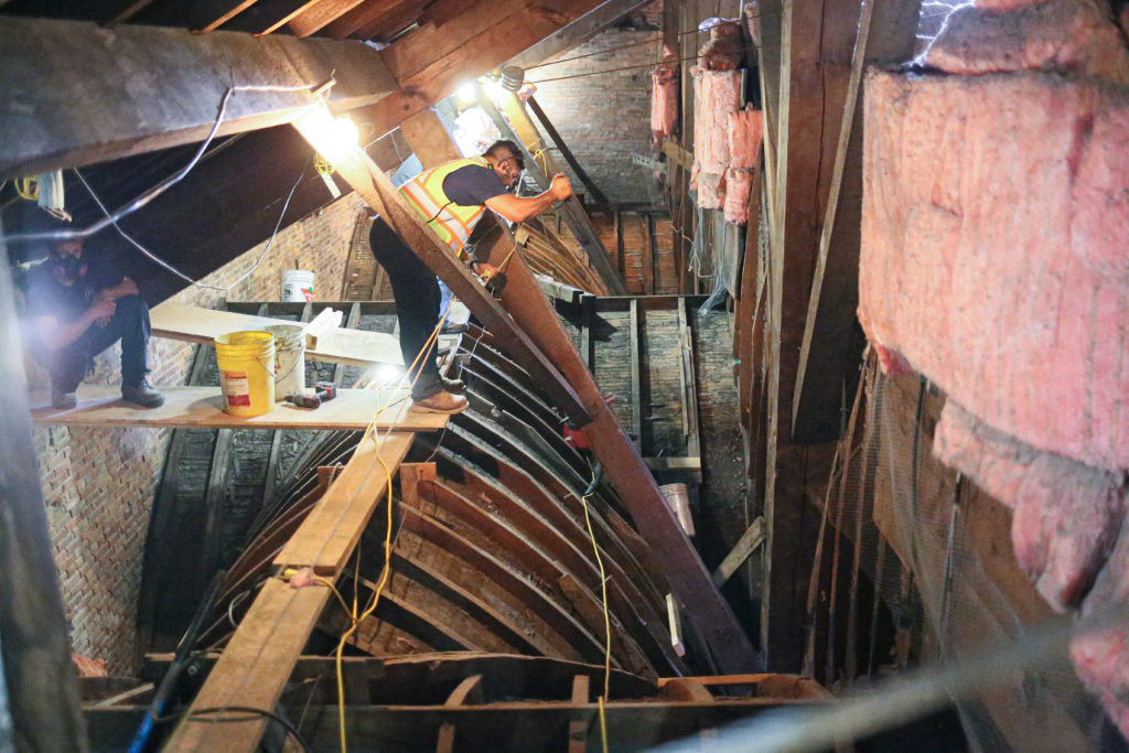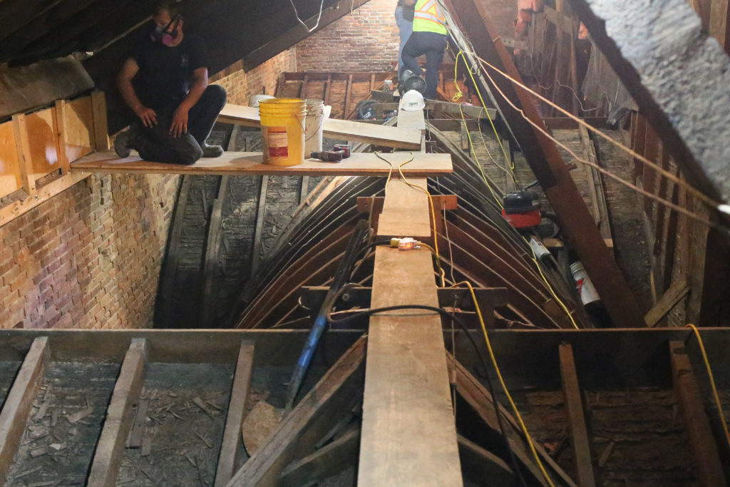 A worker removing debris from inside one of the ceiling’s groin vaults (bottom).