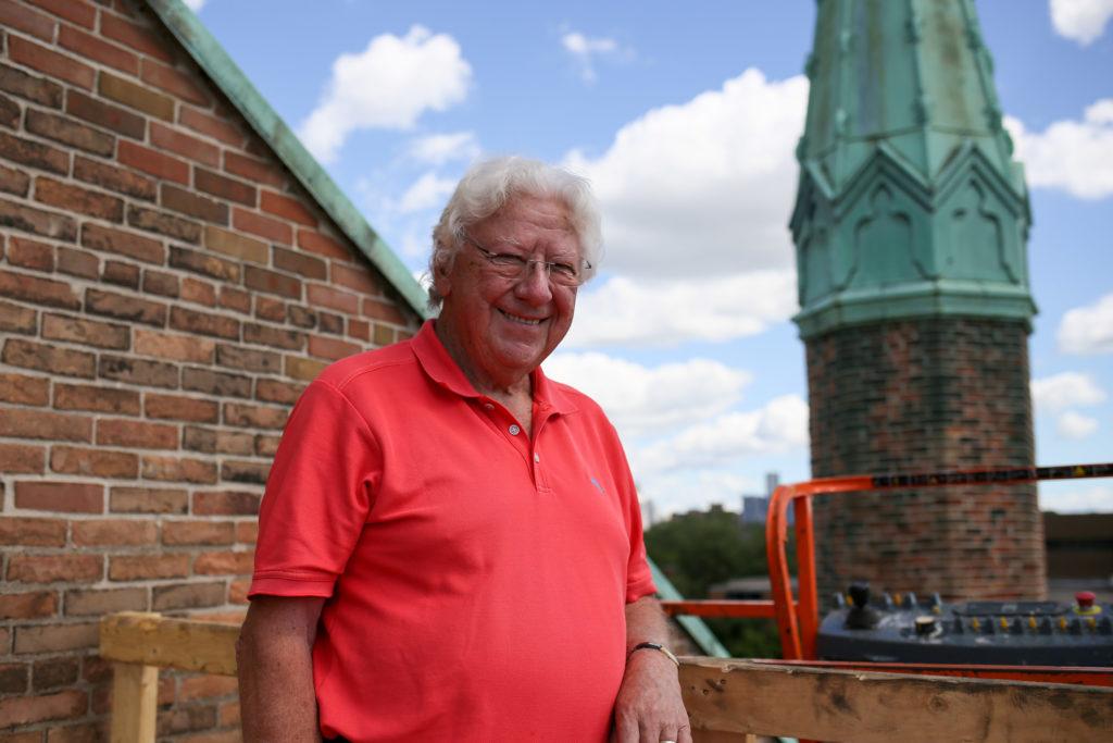 Paul Mullins poses for a photo on a temporary work platform installed on the roof of the church.