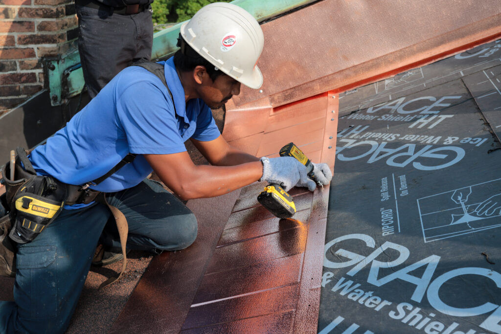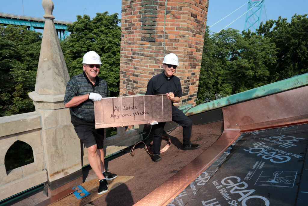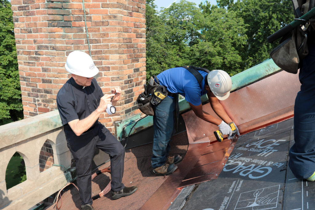 The first copper shingles have gone up on the roof of Assumption Church today! Fr. Maurice and Paul Mullins held a ceremony to place the first shingle, graciously donated by our Christian friends at All Saints Anglican Church.