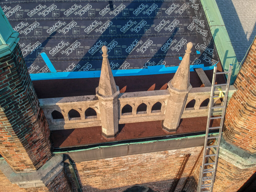 Double AA Roofing’s subcontractor Empire Roofing is completing the highly detailed installation of the 2-ply roof apron on the west side of the church’s roof. This is an area where copper shingles will not be installed until a later date as the area will need to be worked on when the church’s masonry is replaced in a later phase.