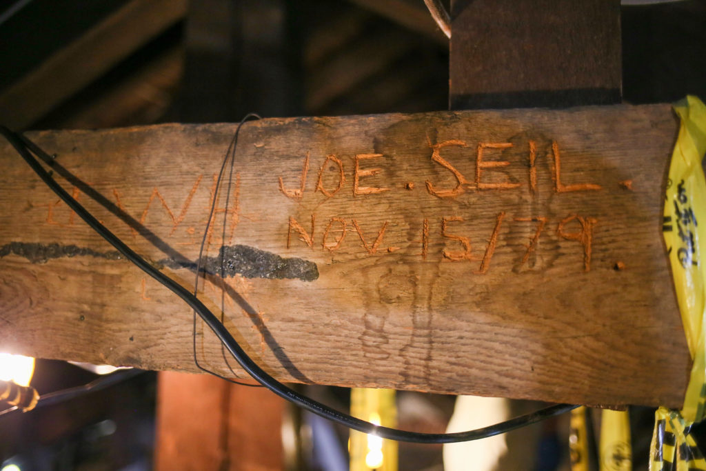 Paul Mullins examines an old catwalk leading to the east aisle. This catwalk will be removed and replaced with a new four foot wide safety catwalk. -
