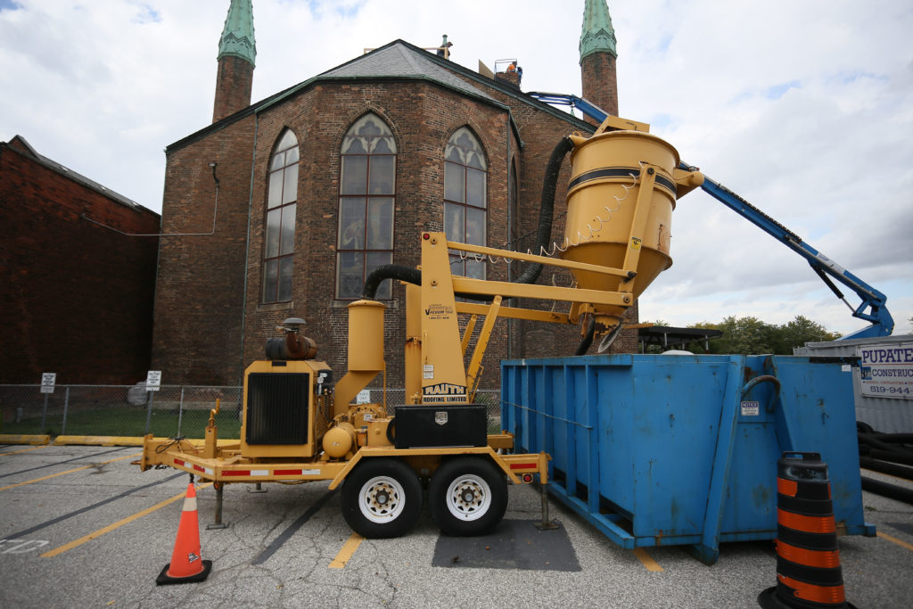 A massive vacuum was used to remove several feet of debris that had been lodged in the attic’s groin vaults.